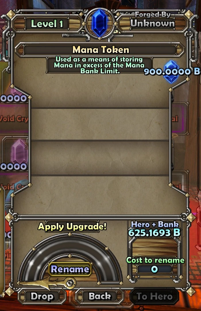 A Mana Token is an item that allows players to store mana beyond the Mana Bank limit (1.0 trillion). It is generated through a free service provided by the Tavernkeep.