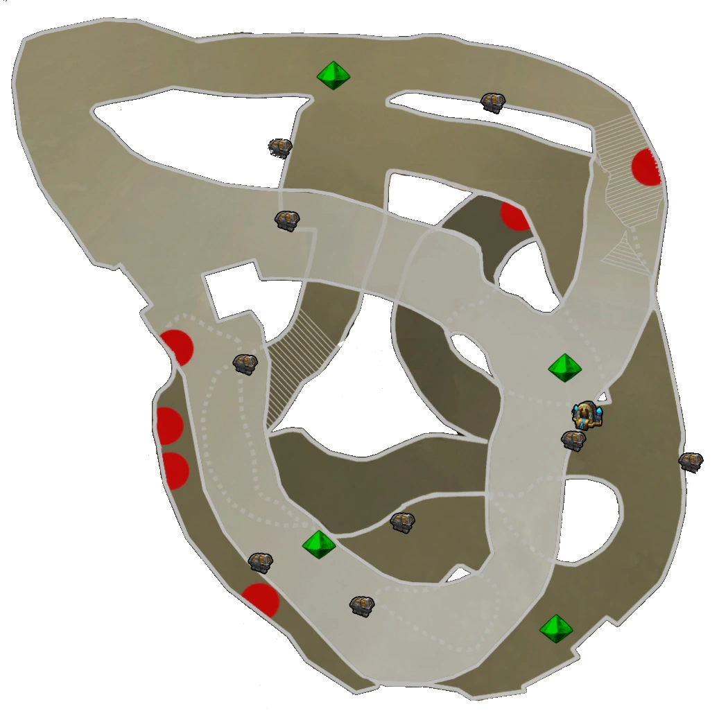 | On Insane or Nightmare campaign, the limited build time is very strict for this map. Two builders are recommended to summon enough defenses near each crystal before the first wave begins. | |||||||||||||||