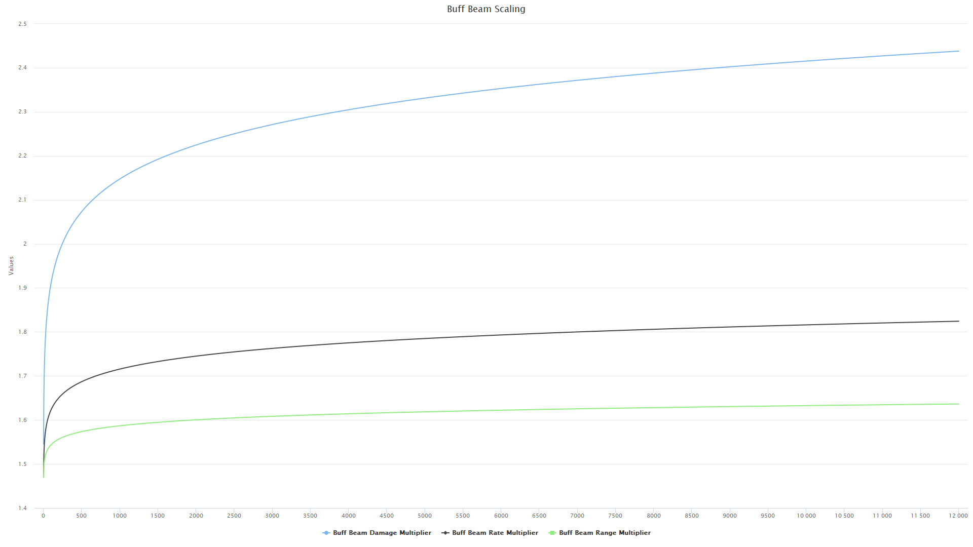 *Each of the Buff Beam's stat multipliers increase by roughly 10% per upgrade level, for a total of ~50% maxed out. The factors in the graph and table below are for a fully upgraded (level 5) beam.